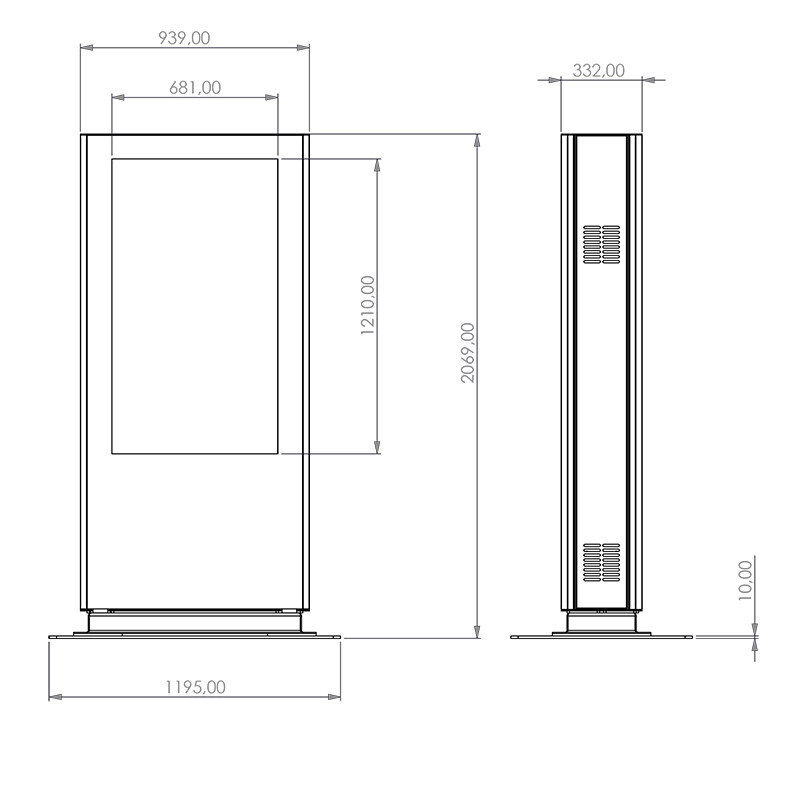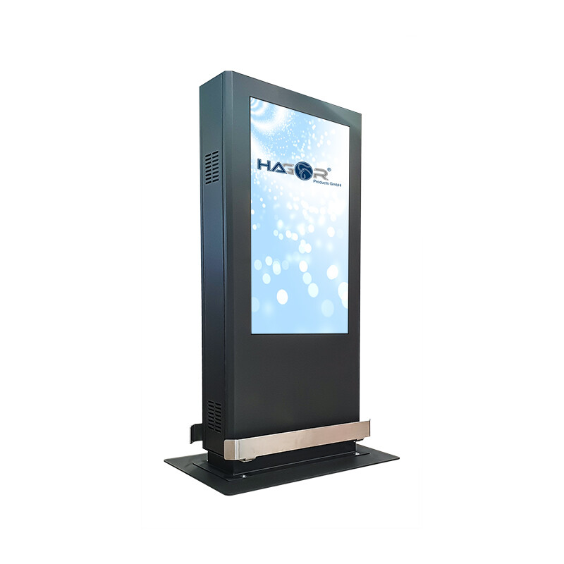 ScreenOut® Pro Back-to-BackOutdoorstele, doppelseitig inkl. Heizung und HQ-LüftungBei der ScreenOut® Pro Back-to-Back-Stele handelt es sich um eine Outdoorstele, welche sich für 2 Bildschirme mit einer Bildschirmdiagonale von 55“ / 140 cm eignet. Die Bildschirme werden dabei „Back-to-Back“ montiert. Die VESA-Aufnahme erfüllt den VESA-Standard bis max. 400 x 400 mm, auf Wunsch kann dieser auf VESA 400 x 600 mm erweitert werden.Die Stele wird aus einer hochwertigen Stahlblech-Konstruktion hergestellt, ist abschließbar und wird mit 6,4 mm starkem, entspiegeltem Verbundsicherheitsglas (VSG) ausgeliefert. Der Sockel bietet Platz für eine verdeckte Bodenverkabelung. Die verbauten Komponenten sind gegen Fremdzugriff und Vandalismus geschützt und über eine Tür zu erreichen.Die ScreenOut® Pro-Serie enthält standardmäßig eine aktive Ventilation durch hochwertige Industrielüfter sowie eine Filterbank, um eine einwandfreie Luftzirkulation (Air Curtain) bzw. Filterung sicherzustellen.Die Outdoorstele ist nach Schutzstandard IP65 / NEMA 4 und IP54-Standard gefertigt. Die Verkabelung und Absicherung wird fachgerechte nach VDE-Vorgaben (E-Check) ausgeführt. Die Outdoorstele ist zudem nach EMV-Vorgaben geprüft und verfügt über das DGUV V3-Prüfsiegel.Die Fronten lassen sich leicht öffnen sodass ein 1-Mann-Service möglich ist. Die volle Service-Zugänglichkeit ist auch im laufenden Betrieb gegeben. Die Innenmaße bieten zudem ausreichend Platz für einen Mini-PC und eine Steckdosen- und Sicherheitsleiste. Der Anwendungsbereich ist, dank Industrielüfter, Industrieheizung und einer 2-fach-sensorgestützten Temperatursteuerung in einem Umgebungstemperaturbereich von -25°C bis +40°C möglich.Die Standardausführung ist zur festen Installation mittels Fundament vorgesehen. Optional lässt sich die Stele in speziellen RAL-Farbtönen oder mit einem Logo individualisieren.Auf Wunsch mit VA-Anfahrtschutz oder Bodenplatte erhältlich.